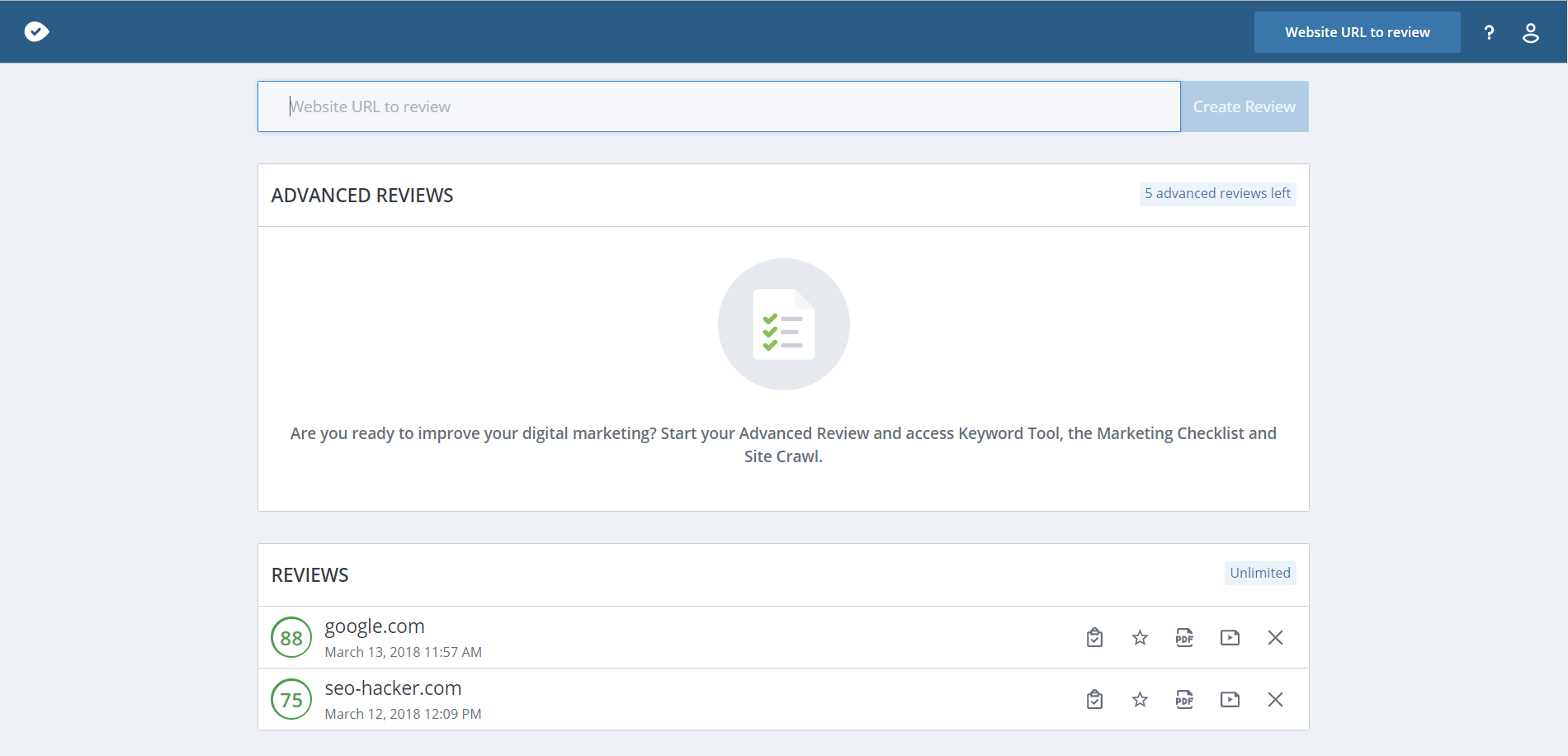 Upon logging into Woorank, you can instantly create a review by simply entering the URL. You can choose between Advanced and Standard Review, with the former providing you with a more detailed report. The amount of Advanced Reviews that you can use is limited, while you can do an unlimited amount of standard reviews. Either way, both options are able to provide you with sufficient amount of data.