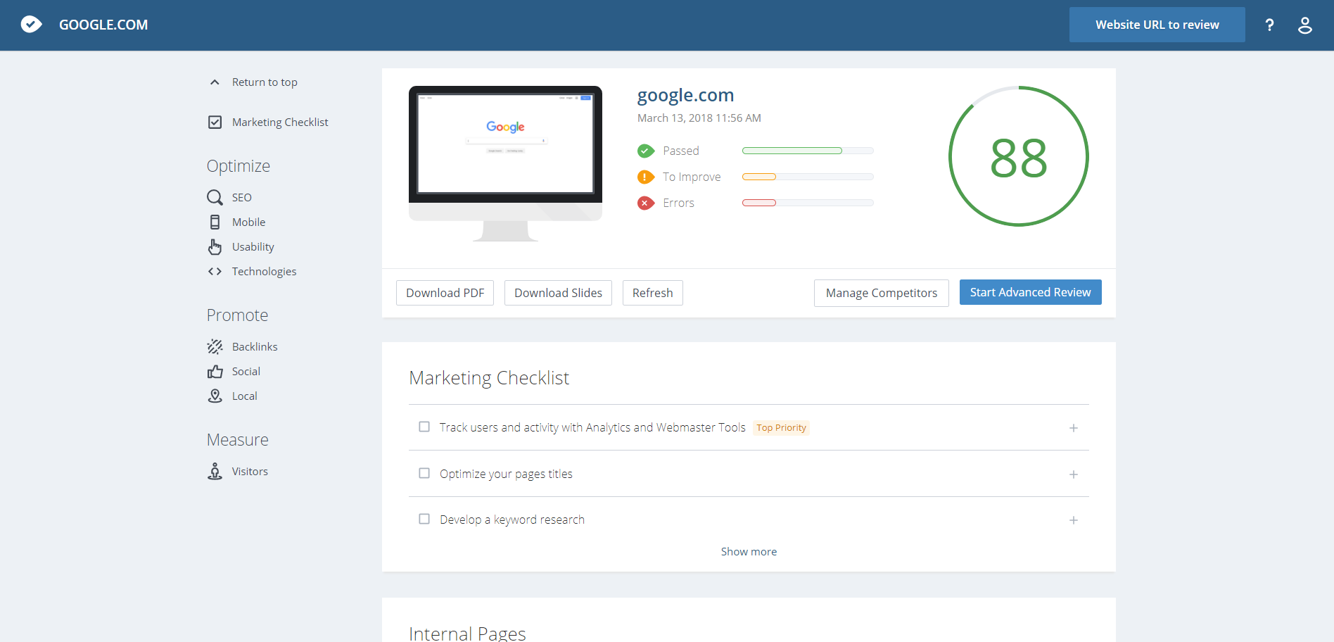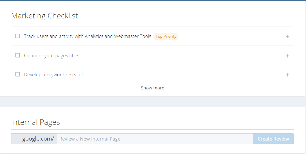 The first section of the review is the Marketing Checklist, which is a list of actions that you can undertake to optimize your website. The checklist is personalized, which means that these steps are tailor-made for your website. You can also perform an internal review of one of the pages within your website, which would provide you with a similar amount of data and steps for individual pages within your website.