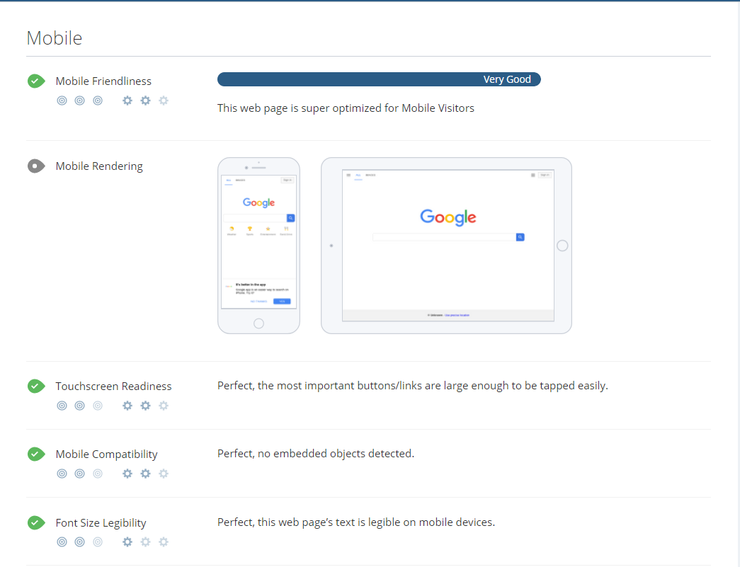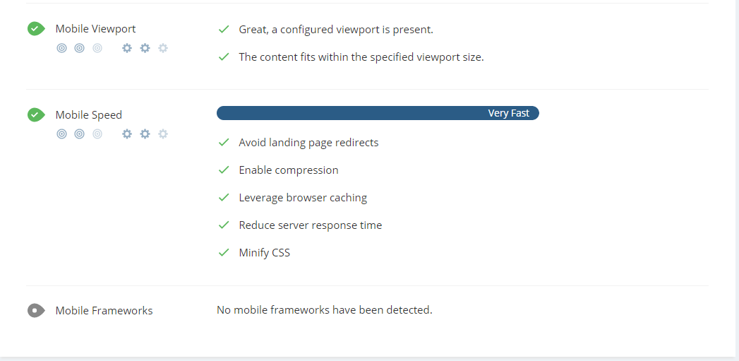 The next three parts allow you to review your Mobile Viewport, Mobile Speed, and Mobile Frameworks. Once again, these are indicators that would help keep your website’s mobile friendliness in check.