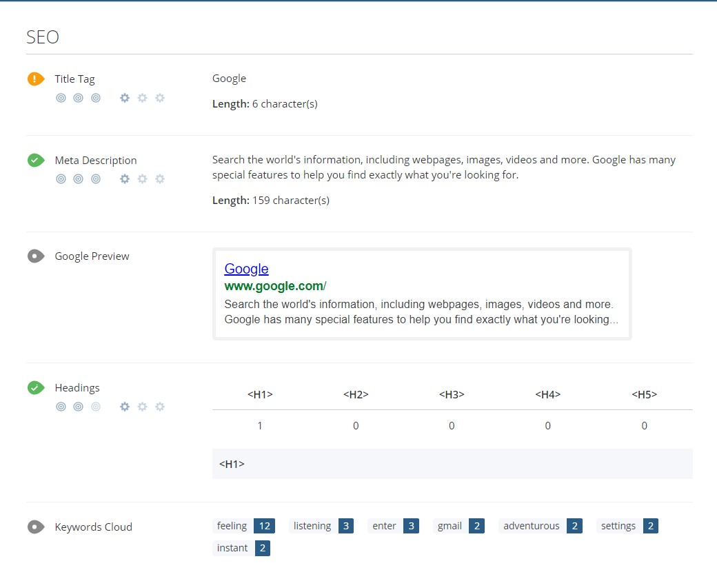 The second section of the website review is about the website’s SEO. This will help you determine how search engine-friendly your website is by looking into key details. The first few segments of the SEO review tackles some of the basic details, such as title tag, meta description, Google preview, headings, and the Keywords Cloud. The Keywords Cloud shows you some of the keywords that are frequently used within the webpage, which helps with your keyword research efforts.