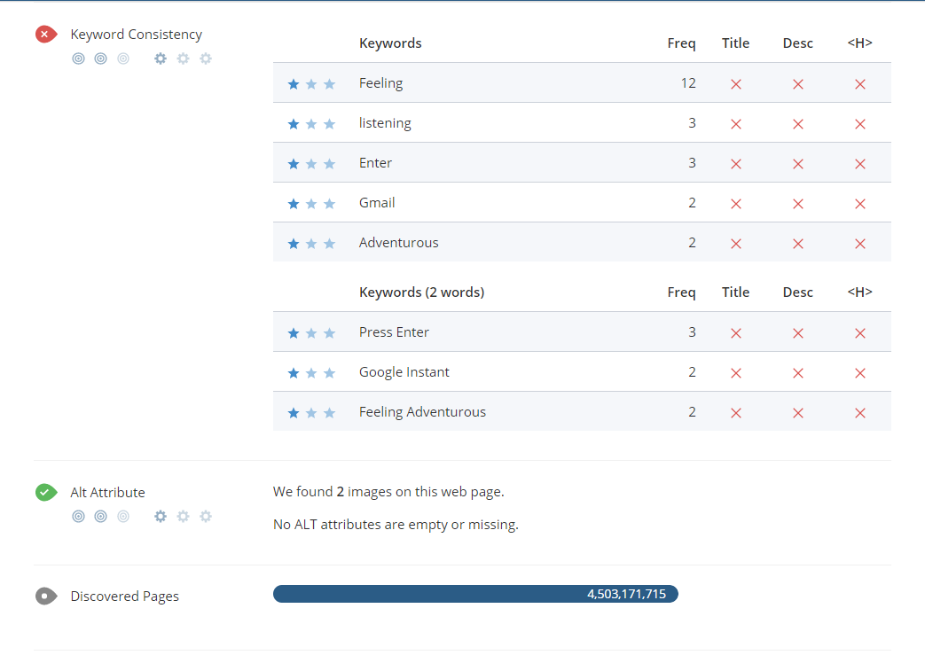The next section shows Keyword Consistency, which shows the most frequently used keywords in the website, Alt Attributes, which help make your images present in search engines, and Discovered Pages, which is the amount of bots that access your page.