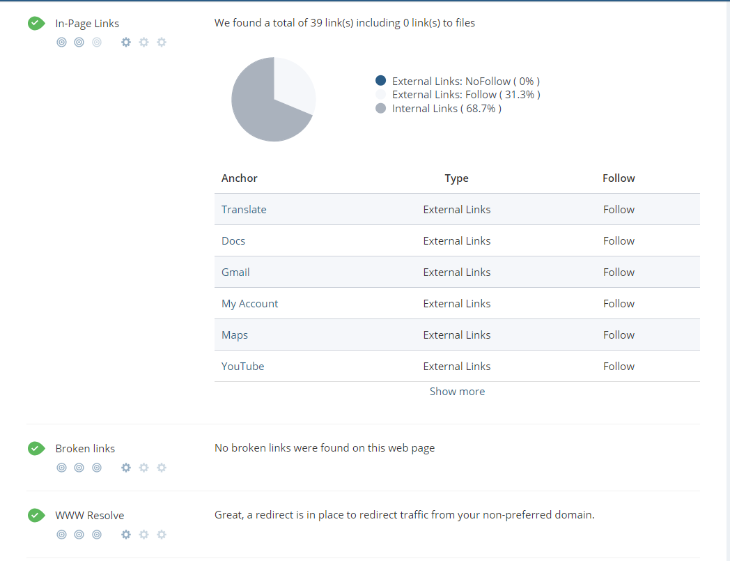 The next section reviews the links within your website. In-page links lists down all the links present in the website, while Broken Links track down links that need to be optimized. WWW Resolve ensures that your website can be accessed with or without the www. prefix.
