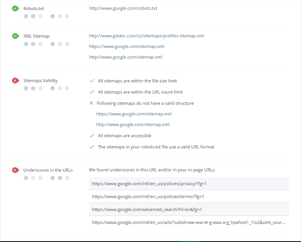 The next section is the Robots.txt, XML Sitemap, Sitemaps Validity, and Underscored in the URLs. Robots.txt and XML Sitemap makes sure that the right pages are being indexed for search engines. Sitemaps Validity and Underscored in the URLs are indicators of webpage searchability, and makes it easier for crawlers to access these pages.
