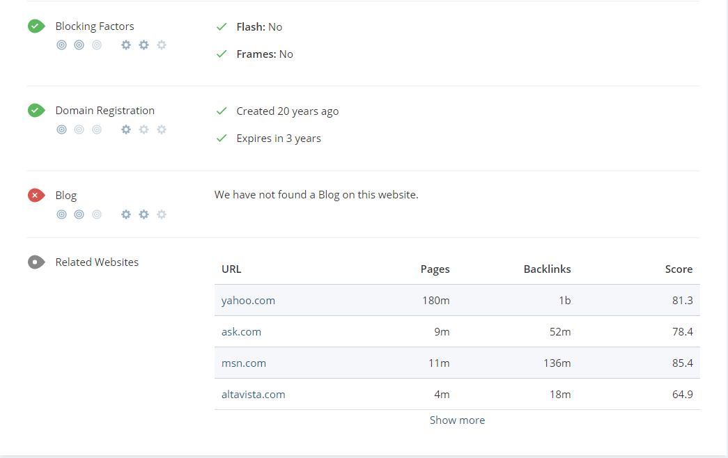 The last part of the SEO section is the Blocking Factors, Domain Registration, Blog, and Related Websites. Blocking Factors is a list of reasons that your website can be blocked or penalized by Google. Domain Registration shows the Domain age, and the date in which the domain would expire. The blog section check if a website has a blog section for posting content. Related websites show your competitors, and some statistics such as pages, backlinks, and their Woorank score.
