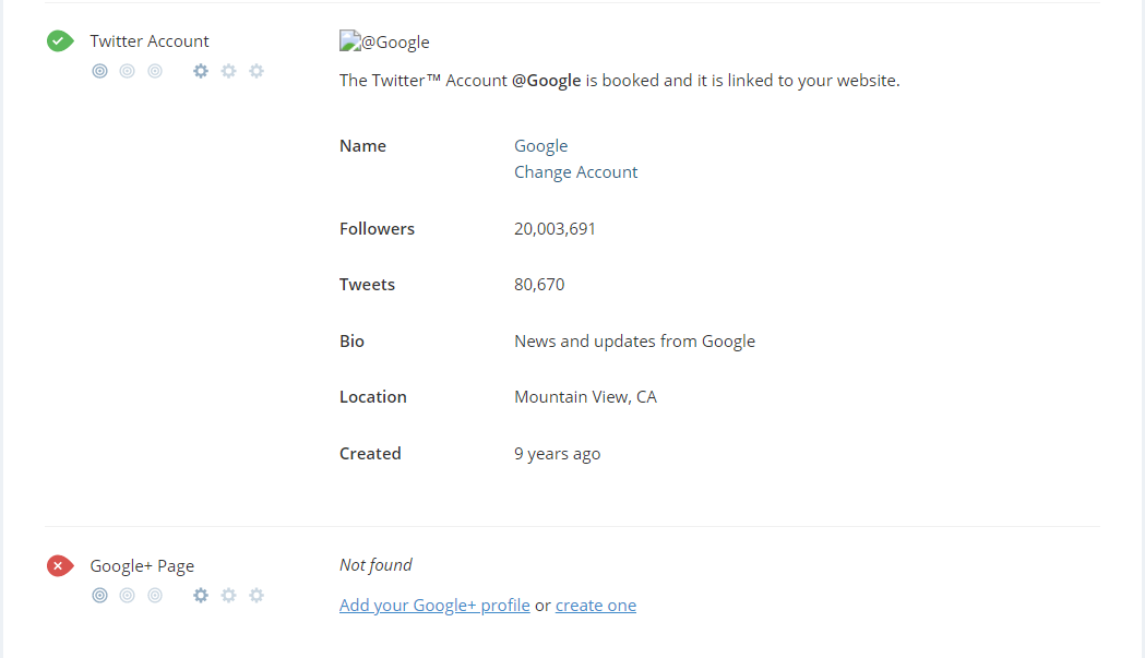 Woorank also checks for your website’s Facebook, Twitter, and Google+ pages. You also get to view some details like number of followers and URLs.