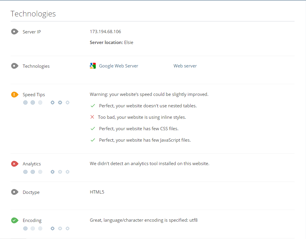 The Technologies section take a look at tools and other applications present in your website, along with details like server IP and document type. You also get some speed tips, which would help you optimize your website and improve the loading speed.