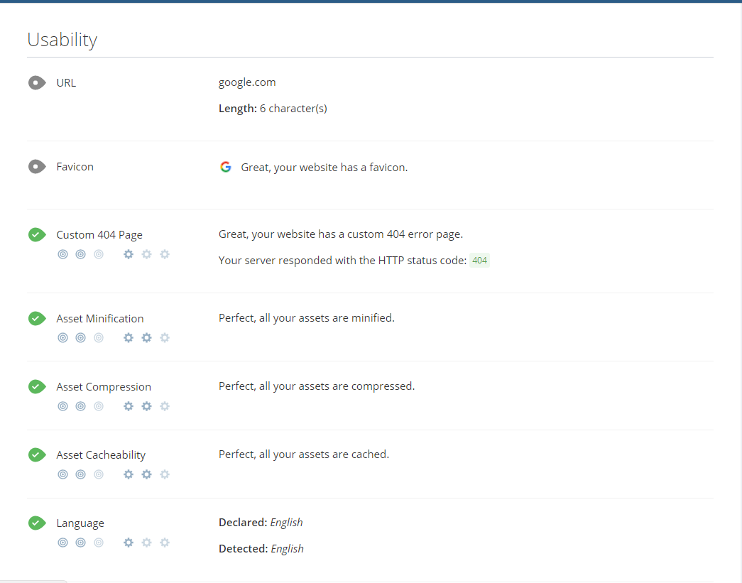 The third section reviews the usability of your website, and is another look the some of the basic details of your website. These include the URL, Favicon, 404 page, Asset Minification, Compression, and Cacheability, and Language.