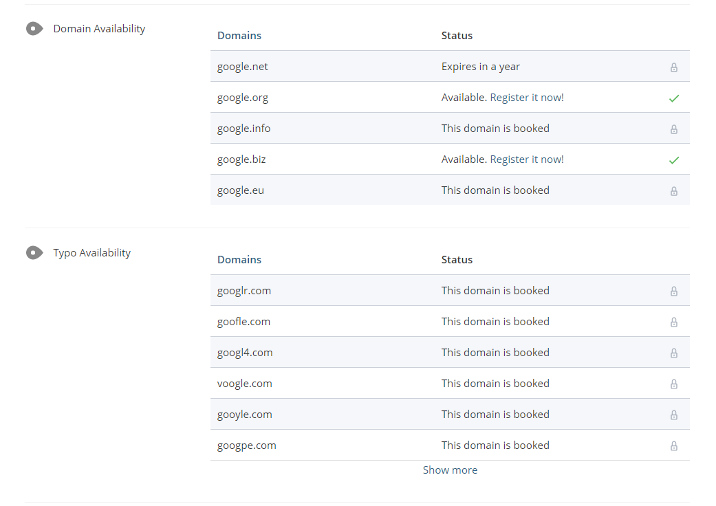 Scrolling down, you also get a list of related domains that are available to be acquired. Since we’re using Google as an example, most of the domains registered under their company, along with the typos, are completely taken. This is helpful for websites that are looking for related domains in different regions, or provide users with another way of being able to find your website.
