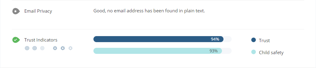 The last two parts of this section includes Email Privacy and Trust Indicators. Email privacy looks for any email address that might be present within your website, which is a sound security measure. Trust indicators are indicators of how reliable the website is, and how safe it is for children to access it.