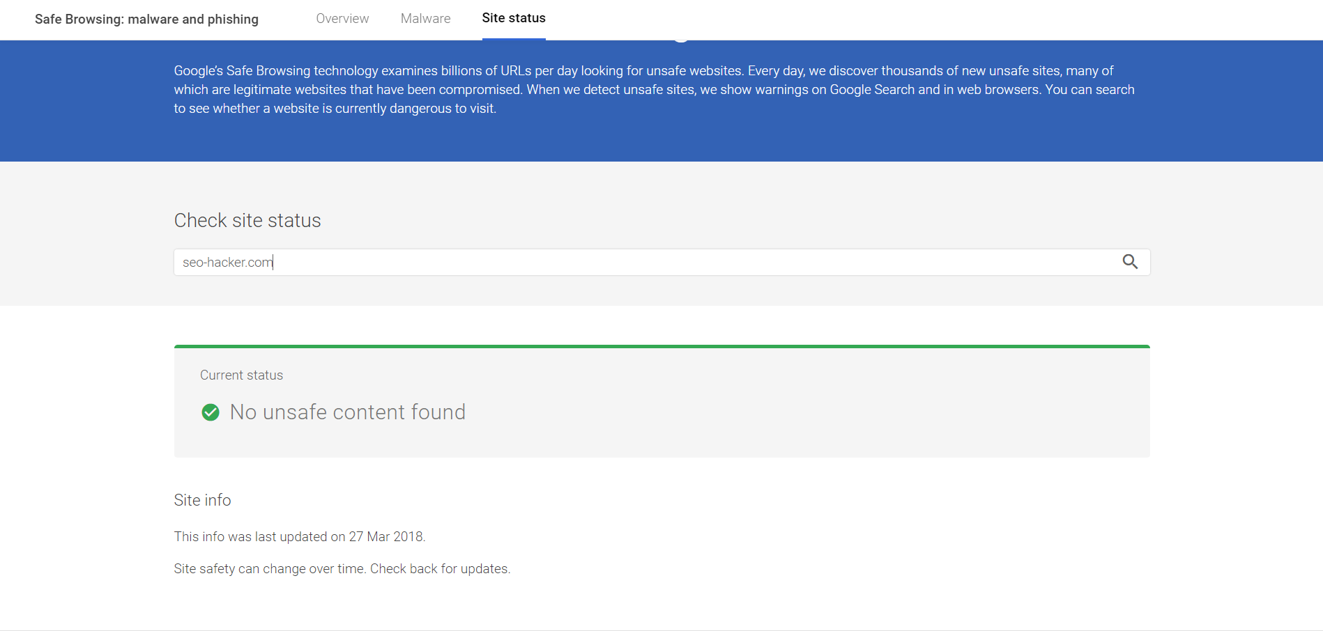 The tool instantly checks your website and gives you the results as soon as you press enter (or that would be the case if the website is completely safe). As simple as it is, this is a tool that would offer you a first glimpse into your website’s safety.