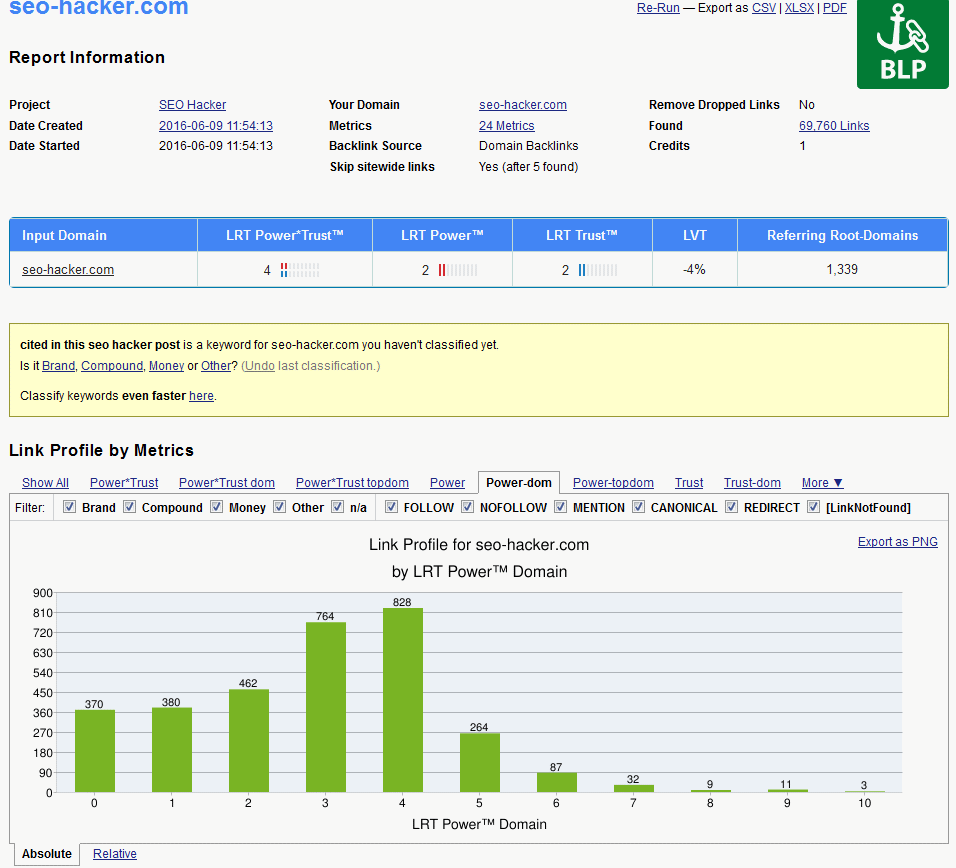 As you can see, it looks almost identical to the QBL report I generated except I added a new category (Link Profile by Metrics) which is shown in a histogram format. As you can see, there’s quite a number of good and powerful domains that are linked to my website with 828 of them having a LRT Power Domain rating of 4. One drawback to all this available data at your fingertips is the time it takes to generate one report. The report I used for this example took roughly 20 minutes to finish generating. If you need to make a full audit of your website’s backlink profile and you have all the time in the world, then this is perfect for you.