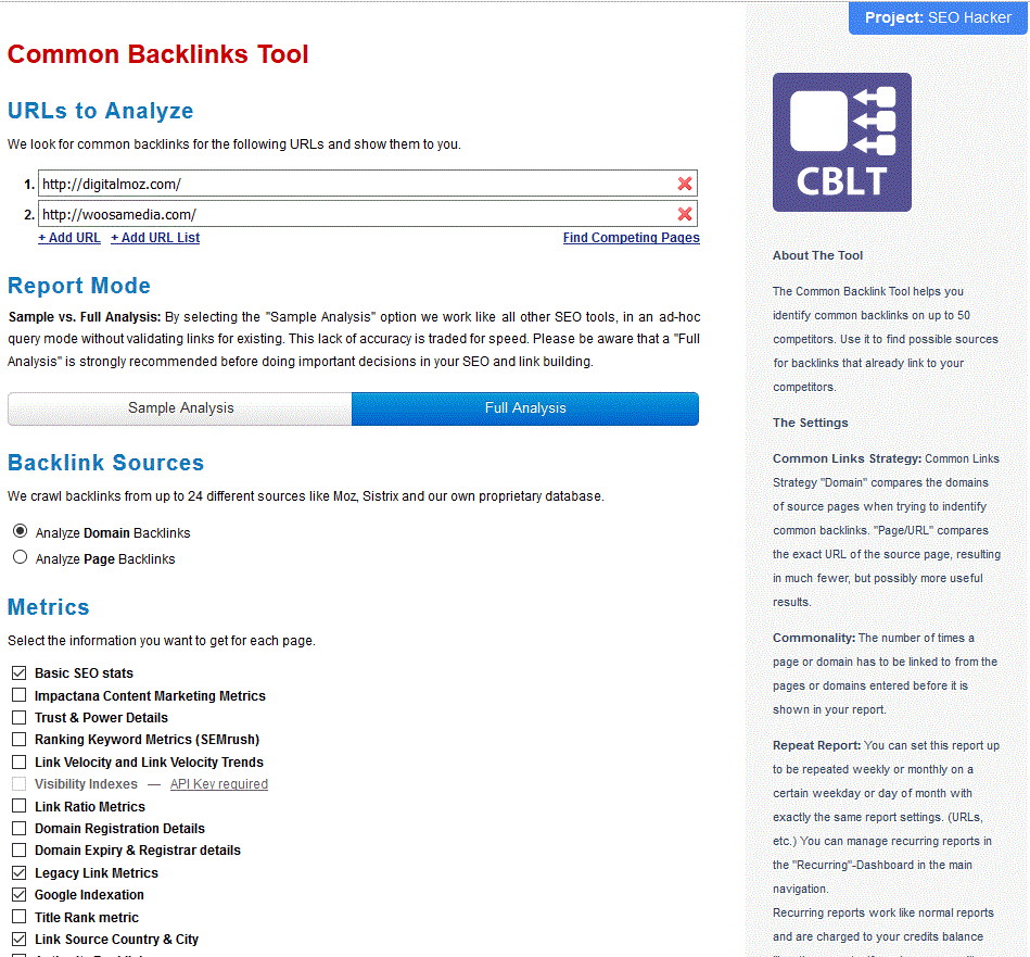What’s better than finding the best links from your competitors? It’s finding the best COMMON links between you and your competitors. This way, you can be more assured of its quality because of the number of competitors that have the same backlink source. The Common Backlinks Tool (CBLT) is just the tool for the job. Up to 50 URLs can be entered whether it be pasted one by one or through a list.