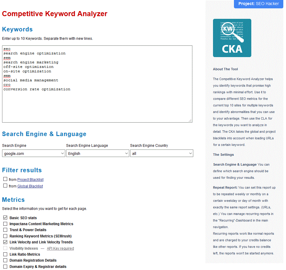 If you’ve always had problems figuring out which keywords you should target for your website in order to beat out your competition, then this Competitive Keyword Analyzer (CKA) is the tool for you. From here, you will be able to determine the keywords that are highly profitable and achievable at the same time. These are what you call the “low hanging fruit” keywords. You can enter up to 10 keywords that you think are the most profitable for your website and from this initial list, the CKA tool will find other potential keywords for you to target.