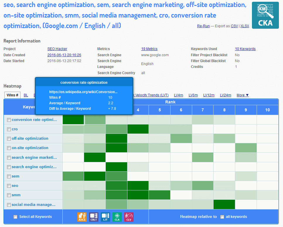 Just like the Competitive Link Velocity (CLV) tool, this one also features a heatmap which gives an easy-to-view table of each keywords and your pre-selected metrics. The different color shades of green represent any irregularities that may be present. There’s even a table which shows well-detailed results for each keyword in the report. All the chosen metrics and filters that you’ll want can be seen here. This is truly a powerful tool to use for competitive keyword research.