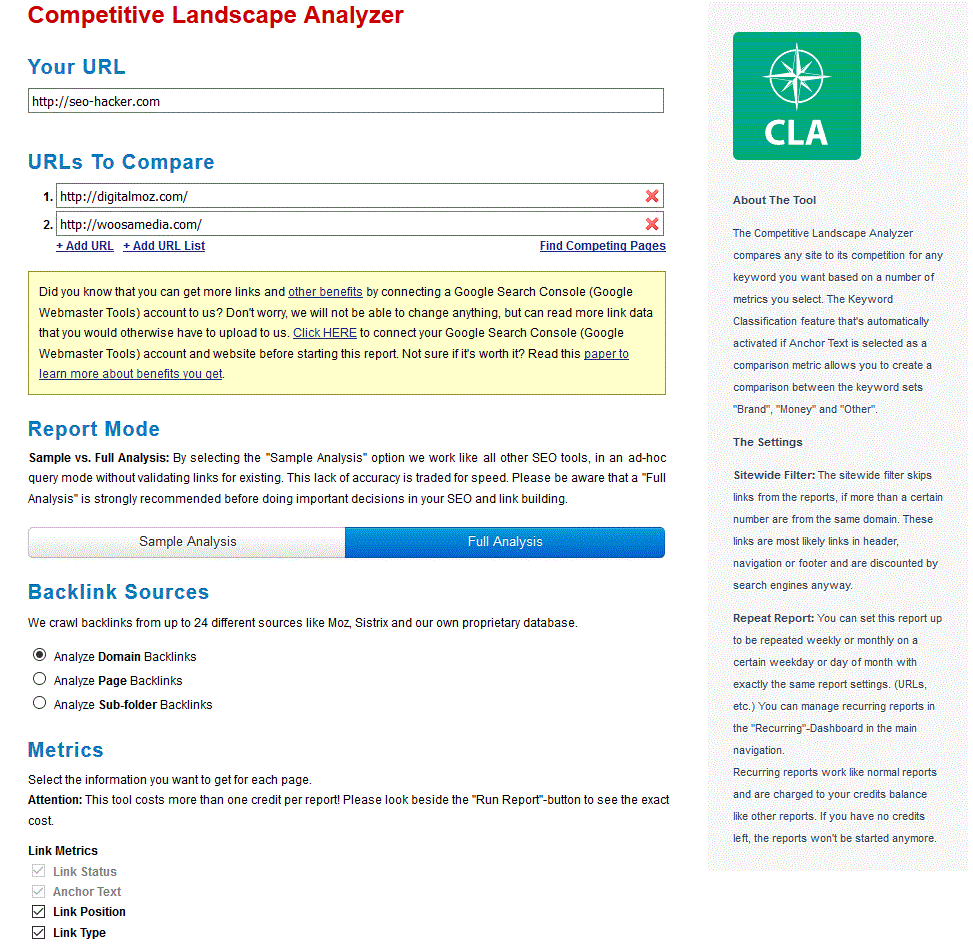 Understanding your competition is one of the most important steps in business, sports, or any other field of competition. Of course, this also includes the competition over the web. One of the many tools that can help in doing essential competitive analysis is the Competitive Landscape Analyzer (CLA). This tool can give you a general idea of what your competition is doing by comparing certain metrics of theirs against your own. The goal of this report is to give users a leg up on their competition through the data that will be generated. Note that throughout the following Competitive Analysis reports that will be shown in this review, the two competitors that will be referenced here are Digital Moz and Woosa Media. Also note that you can add up to 10 competitors.