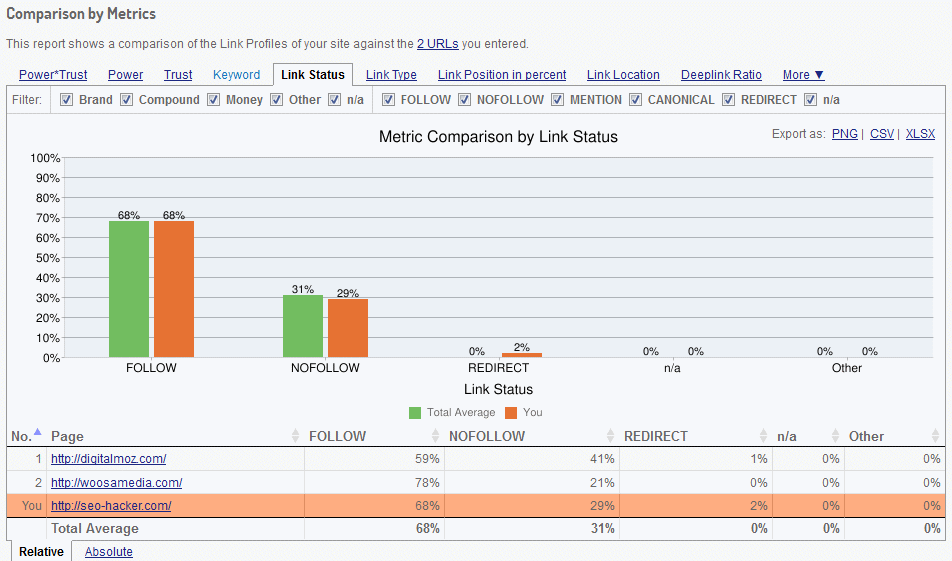As can be seen in the image above, several metrics can once again be chosen for the report. In this example, we can see the ratio of DoFollow and NoFollow links of the SEO Hacker website and the chosen competitors. There’s no solid rule when it comes to the most appropriate ratio of DoFollow vs. NoFollow links however, if we assume that a 70:30 ratio is the ideal ratio in this case, then the SEO Hacker website is almost right on the money compared to its competitors. If you wish to drill down to more specific sub-folders or individual pages, this is possible with this tool. You’ll want to do this if you want to save time as well as do a focused competitive analysis.