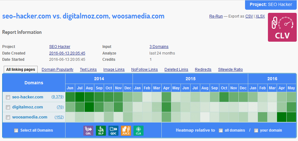 Upon generating the report, you’ll be able to see a heatmap-like chart. The darker the shade, the more links were built during that specific time period. In this example, both SEO Hacker and Woosa Media had roughly the same link growth rate during the mid-2014. For October 2015, SEO Hacker’s link growth was higher compared to its competitors. Spikes do happen naturally at times like if there’s a special event or if a post went viral. In other cases, this can happen unnaturally as a result of negative SEO. If you place the cursor over any part of the heatmap, you can find more details such as linking pages, types of links, redirects, and other data in order to get a better idea of what might have caused the sudden spike or slow down of your website’s link growth.