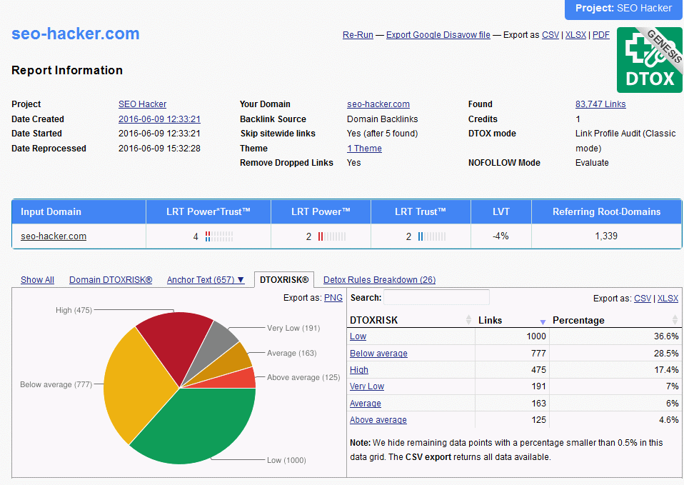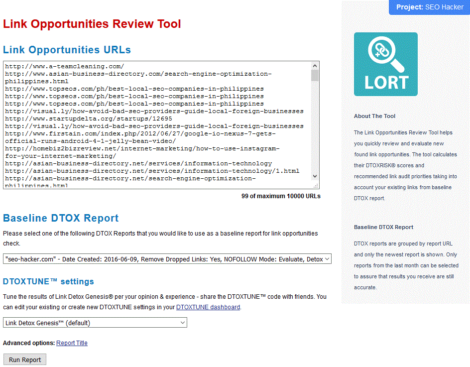 If you have a list of links that you think are good opportunities to build on, it might be wise to check again. You need to be sure that these links pose little to no risk to your website. Here’s where the Link Opportunities Review Tool (LORT) comes in. This tool can be used to evaluate the link opportunities you have selected to build on right before you actually build on it. The LORT report can use the existing Link Detox report to achieve faster results.