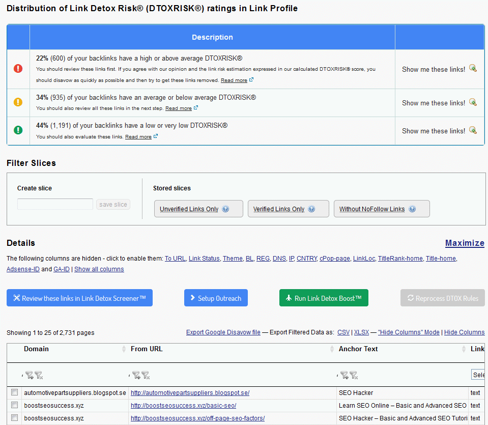 The tool also allowed me to see the percentages of links that have low, average, or high DTOXRISK ratings as well as several other metrics that can help me determine if the links are indeed a magnet for Google penalties. This is certainly a good step towards making sure that my website stays penalty-free. There’s even a link to run the Link Detox Boost tool which is what I’ll cover in the next section.