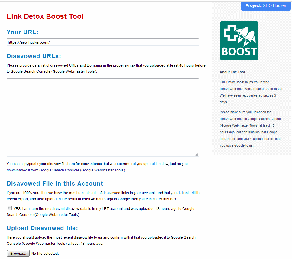 If your website is hit with a penalty by Google and you follow the steps to get bet back into Google’s “good graces” and if you find the process to be too slow, look no further than the Link Detox Boost tool. Google will only take into account your disavow file after it has completely re-crawled all the links in it. So the whole point of the tool is to “boost” or speed up this process. You can even see the date when Google’s last crawl was so you can make sure if all your links have indeed been re-crawled.