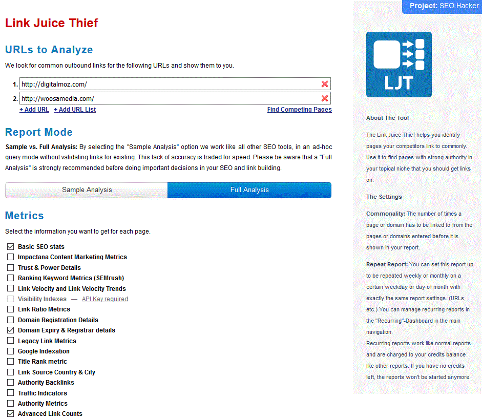 This Link Juice Thief (LJT) tool is similar with all the other competitive analysis tools reviewed above such as the Common Backlinks Tool and Missing Links tool. The main difference is the approach because the idea is to get backlinks from the domains/pages that your competitors are linking to. This way, they would be indirectly linking to you as well.