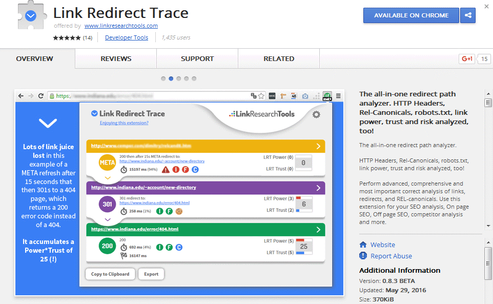 For an even more seamless experience for link redirect analysis, LRT has developed the Link Redirect Trace Extension. It brings the Link Redirect Trace Technology to the web browser and as a result, it provides an efficient way to track redirects and headers while browsing through your chosen website. It can detect every redirect hop (for example, what redirect type was used…is it 301, 302, 303, so on and so forth), analyze robots.txt, and analyze HTTP header X-Robots Noindex, Nofollow, NoArchive among others. As of now, it is only available for use in Chrome browsers so hopefully, it can also be made for use in Firefox in the near future.