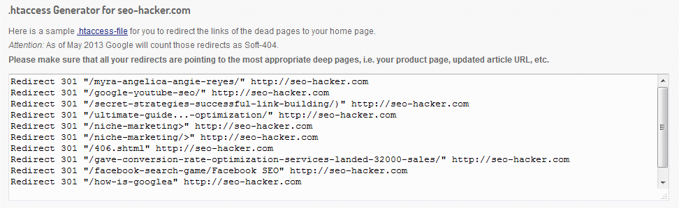 After the report is generated, you’ll be able to see how many backlinks are affected by the 404 (or dead) links in your website. This report can give you a general idea of which dead links should be prioritized in its revival. There’s also a quicker option to do this and that’s through the .htaccess Generator. You can redirect all the dead pages to your homepage but of course, it is always better to link it to the most appropriate and most relevant pages. This is truly a great tool to have when you are transferring to a new domain or simply checking your website for any dead links that can be found.