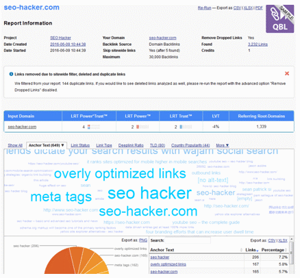 So apart from LRT’s own set of metrics, a nice touch here is the inclusion of an anchor text cloud that’s easy to interpret as well as the other usual data such as link types, link status, country popularity, and the like. You can even see your data in tabular format. This definitely proves that the QBL tool is great way to get fast and easy analysis of your website’s link profile.
