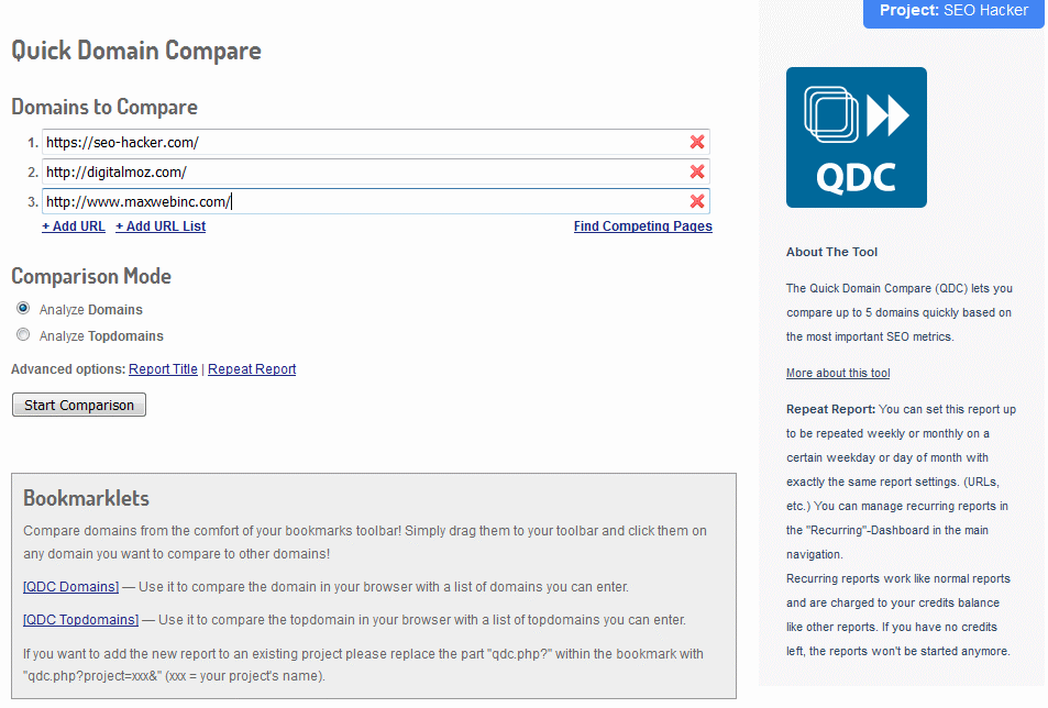 Do you have an emergency meeting and are required to present a quick competitive analysis? Then the Quick Domain Compare (QDC) tool will surely help you out. Generating this report only takes a few seconds so you can even generate this report while you’re having that meeting if you want and you’ll still save face.