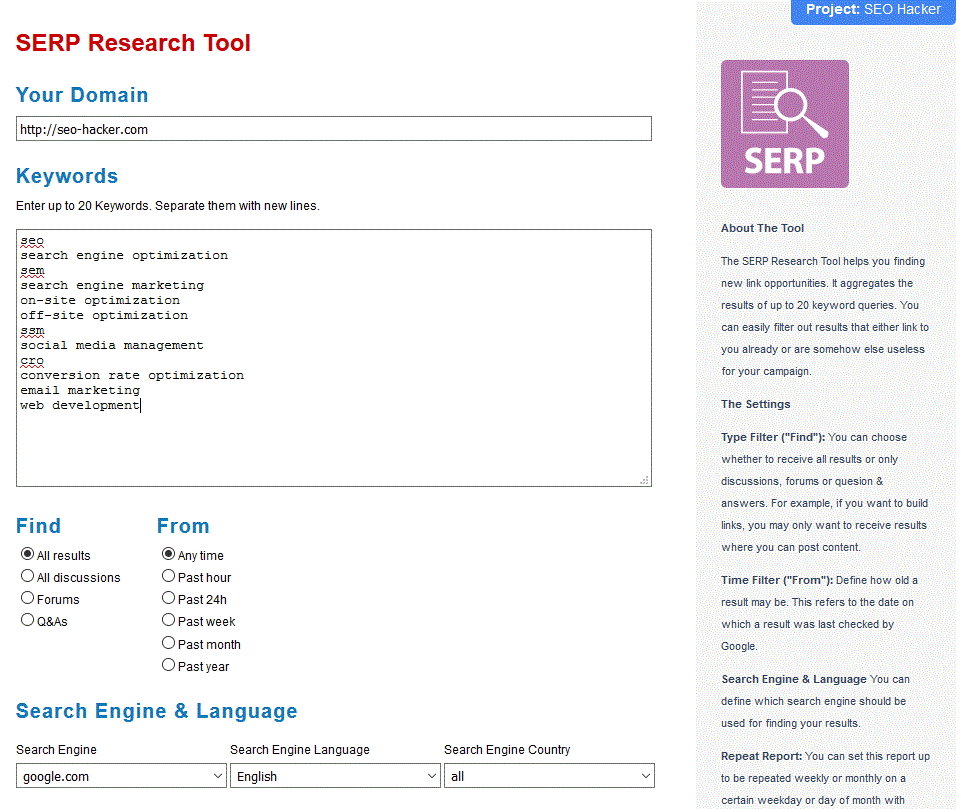 This SERP Research Tool is yet another excellent tool to use for link prospecting. It pulls the first 200 search results from the search engines from the keywords entered and shows the various metrics that can be chosen when generating the report. From the type of website that you’re looking for to the specific search engine that you want to use, this report allows you to choose all of that.