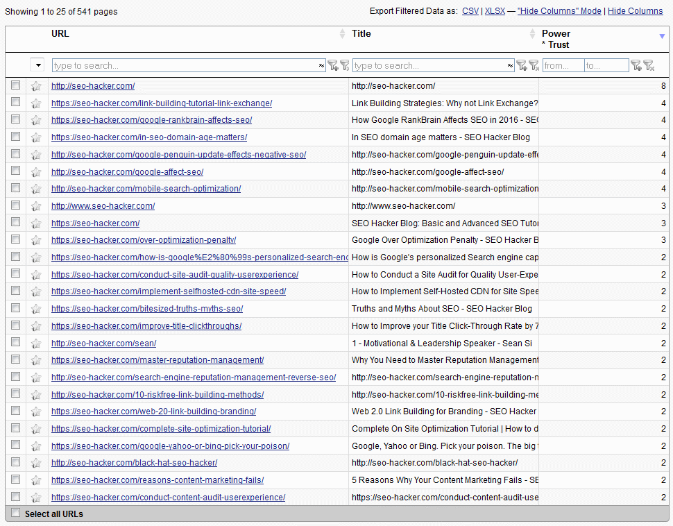 This is one of the tools covered by my 2014 review of LRT – the Strongest Subpages Tool. It goes through each sub-folder and sub-page in a certain domain in order to find the most ideal placement for one’s link. So if you’ve had trouble finding that perfect spot for a guest post, for instance, make sure to keep this tool handy. One of the biggest differences between the tool then and now would be the use of the LRT Power*Trust metric instead of just “Strength” (although it pretty much means the same thing). With 541 pages being generated (compared to 291 previously), as expected once again, my homepage is considered to be the “strongest” sub-page in my website followed by my article on Link Exchange. So if any of you have a decent resource for this article that can convince me to link to your website, you’re welcome to try.