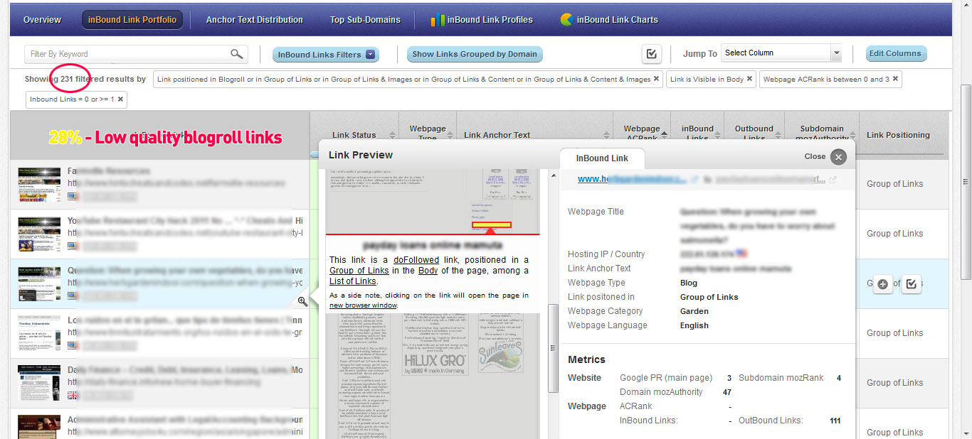 Order ascending by Majestic AC Rank, so that you see the lowest quality pages first. Browse a bit through the links and use the link preview feature to quickly preview those pages. In our case we found 138 low quality links coming from different pages on various link networks.(17% of their entire backlink profile)