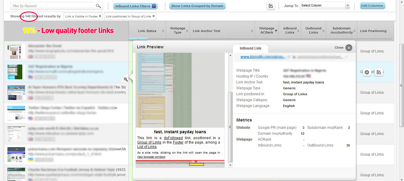 This will select all the links that appear in blocks of links in the footer of the linking pages. We need to apply the “Group of Links” filter so that we do not have invalid results (links that appear in blog posts that are in the footer area of the page … ). For the site we analyzed we extracted 148 low quality footer links. (18% of their entire backlink profile)